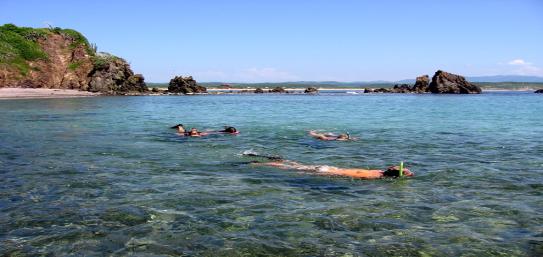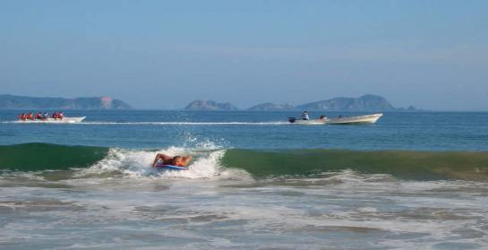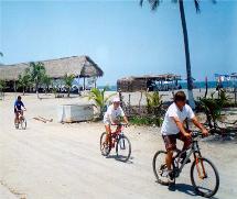 | Some other activities in the area are hiking, biking, horseback riding and some of Mexico's best golf courses like the ones at the El Tamarindo or Isla Navidad resorts. You can even walk the flat beach several miles north to the little village of Boca Iguana. Scuba diving trips can also be arranged for about $50 per person. You can also sign up with one of the local tour guides and discover the natural wonders of La Manzanilla and the Central Coast of Mexico. You can take a guided tour into the local tourist attraction: the nearby mangrove lagoon where you can see many well-fed crocodiles, heron, ibises, egrets and kingfishers. This is truly an exciting nature adventure. The crocodiles can also be viewed close up at the north end of the main street, Maria Ascunsion. This area has many activities for water lovers of all kinds. It has great fishing including tuna, dorado, jack, and sailfish. It also provides safe harbor for many sailboats and power yachts. The snorkeling, swimming and diving in the area are excellent and the warm water is perfect for a relaxing float or scuba diving in nearby Melaque. Guided kayak and Bay tours are available. The Bay is visited by dolphins and humpback whales. Hours can be spent just watching the local pelicans and cormorants dive for fish. Occasionally locals also offer jet ski rentals and rides on a "banana boat" pulled by a motor boat. About 40 minutes north is a bay where surfing is usually good. Good snorkeling is located at the south end of the beach. Under the cliffs there are several circles of rocks that peak above the waterline. You can see the rocks in several of the pictures on this website. For a good day trip you can snorkel or scuba dive directly across the Bay at the village of Tenacatita known for its excellent reefs, about a 30 minute drive. Excellent shopping can be found back south 20 minutes in either the cities of Melaque or in the tourist town of Barra De Navidad. One kilometer down on the right on the road to Barra is a water park. Further south on Highway 200 is the largest port on the western Mexican coast, the double-bayed city of Manzanillo. It is about an hour and a half south by car, 45 minutes south of the airport, and has good shopping, tourist activities and several malls. The large city of Colima is about 2.5 hours away and has many cultural and shopping opportunities. Not far to the east of that city is one of the largest active volcanoes in Mexico. For something different you can check out the warm geothermal pools next to the river 20 minutes north of La Manzanilla on the main highway at the little village of Agua Caliente. |